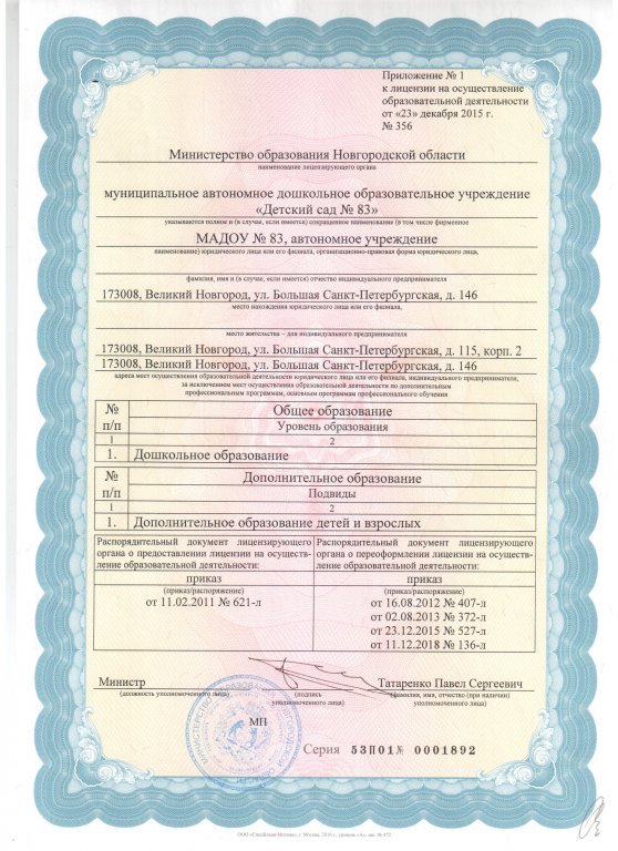 | Адрес местонахождения образовательной организации* | Место нахождения 1 корпуса:173008, г. Великий Новгород, ул. Б. Санкт-Петербургская, д. 146; Место нахождения 2 корпуса: 173008, г. Великий Новгород, ул. Б. Санкт-Петербургская, д. 115, к. 2; Место нахождения 3 корпуса: 173008, г. Великий Новгород, ул. Вересова д.4. |